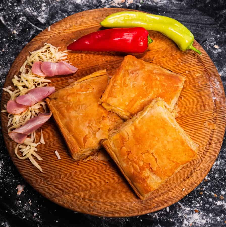 Γέμιση: Ημίσκληρο Τυρί Γκούντα , Κεφαλοτύρι, Ωμοπλάτη Ζαμπόν , Ηλιέλαιο, Αλάτι, Πιπέρι.